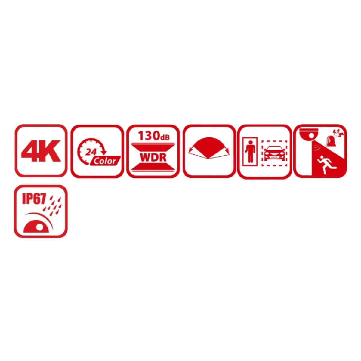 La DS-2CD3T87G2P-LSU/SL de Hikvision es una cámara IP tipo bala con resolución 4K (8 MP), equipada con tecnología ColorVu para visión a color en condiciones de baja iluminación. Incorpora micrófono, bocina y luz blanca para funciones disuasivas activas, además de analíticas AcuSense que permiten distinguir entre humanos y vehículos, reduciendo falsas alarmas.