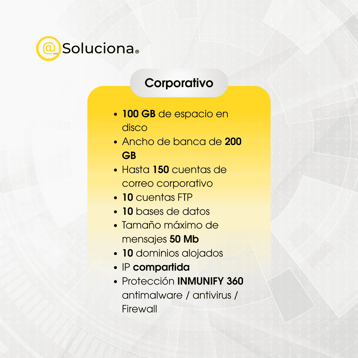 El Paquete Corporativo está diseñado para organizaciones que requieren una solución robusta, escalable y segura para alojar múltiples sitios web, gestionar correo corporativo masivo y operar sistemas internos. Con amplio almacenamiento, tráfico mensual elevado y herramientas técnicas completas, es ideal para entornos colaborativos, departamentos diversos y marcas con presencia digital consolidada.