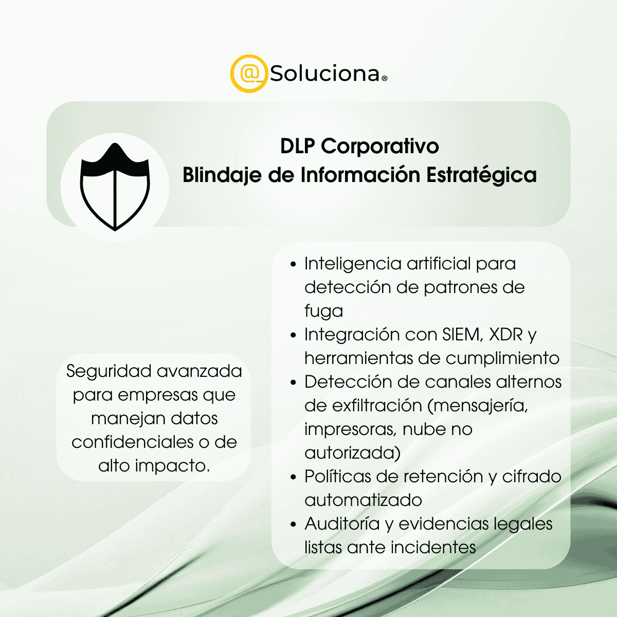 - Detección de canales alternos de exfiltración (mensajería, impresoras, nube no autorizada)