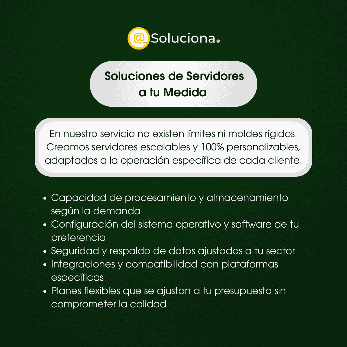 Soluciones de Servidores a Tu Medida En nuestro servicio no existen límites ni moldes rígidos. Creamos servidores escalables y 100% personalizables, adaptados a la operación específica de cada cliente.