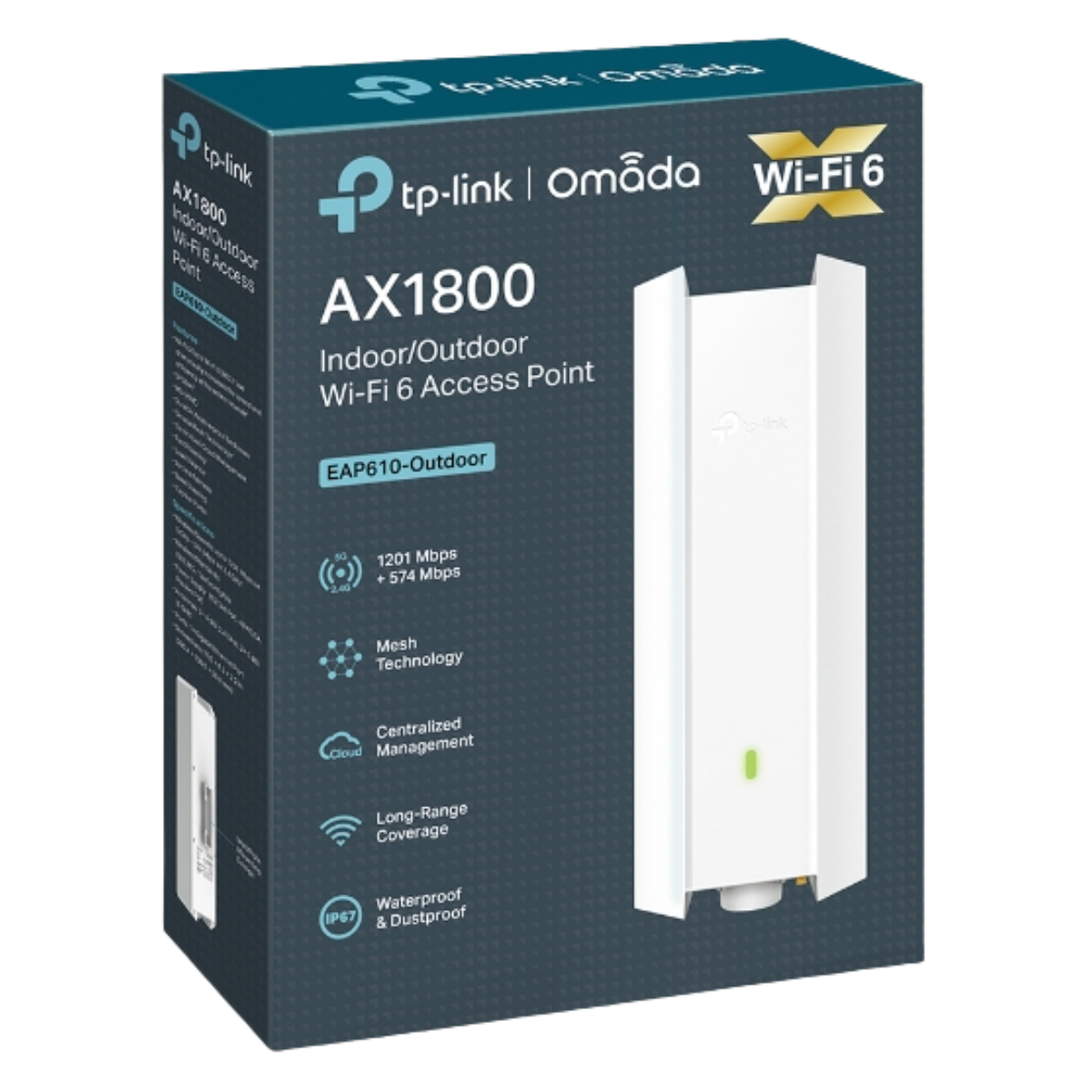 El EAP610-Outdoor de TP-Link es un punto de acceso inalámbrico de alto rendimiento diseñado para entornos exteriores exigentes. Ofrece conectividad Wi-Fi 6 con velocidades combinadas de hasta 1800 Mbps, ideal para patios, jardines, estacionamientos, campus y zonas públicas.